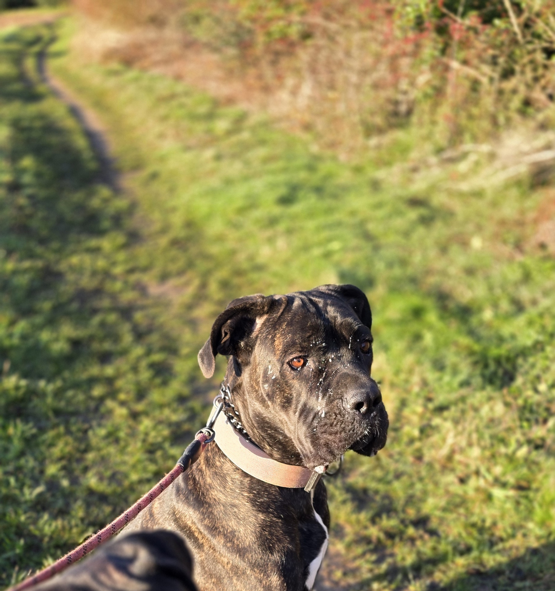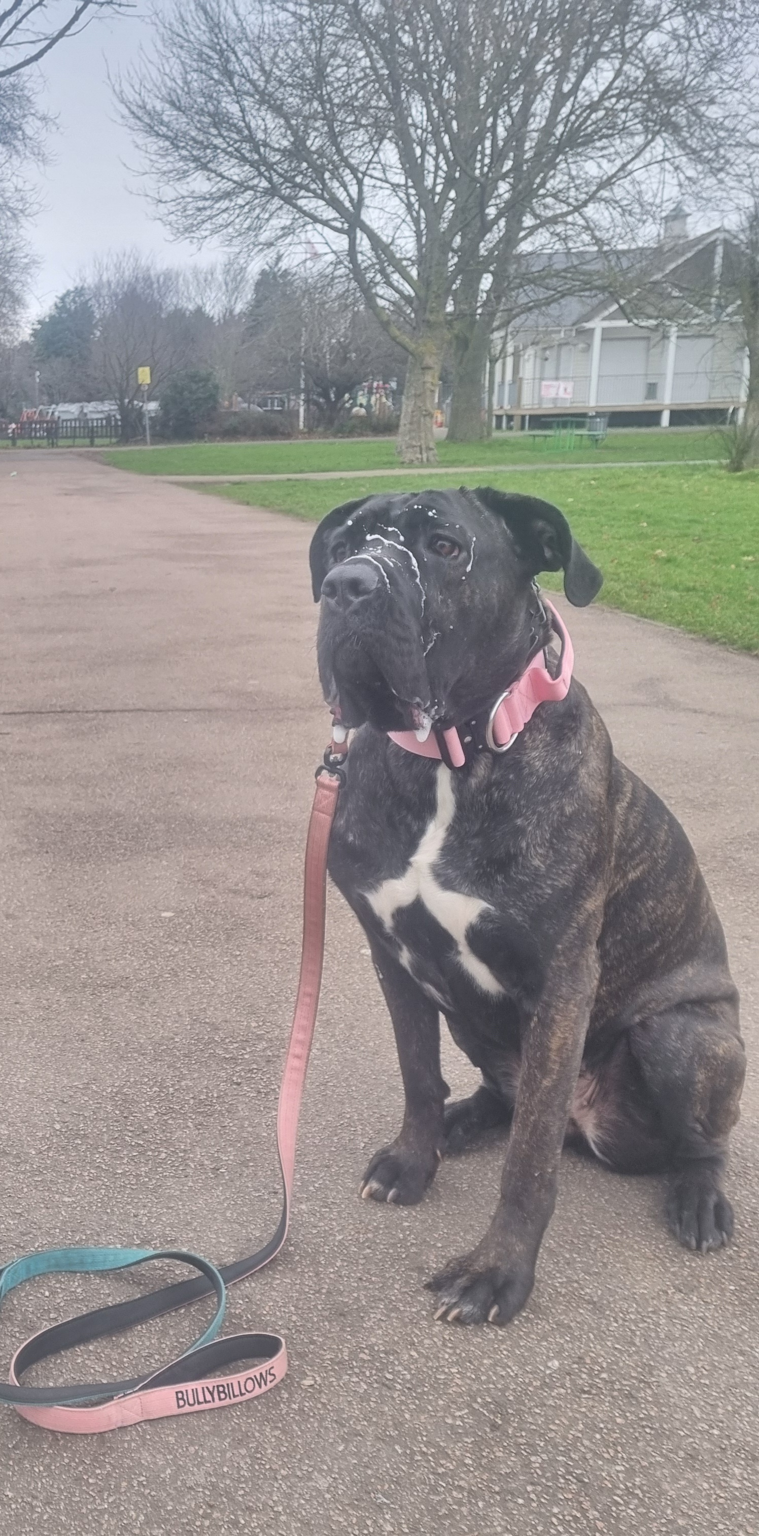 Storm loves people, she loves getting attention from people. She is really well trained, walks on lead (not 100% recall), crated, can stay on her own for periods of time. She does like other dogs but due to her size can play rough. She has grown up with kids around her.