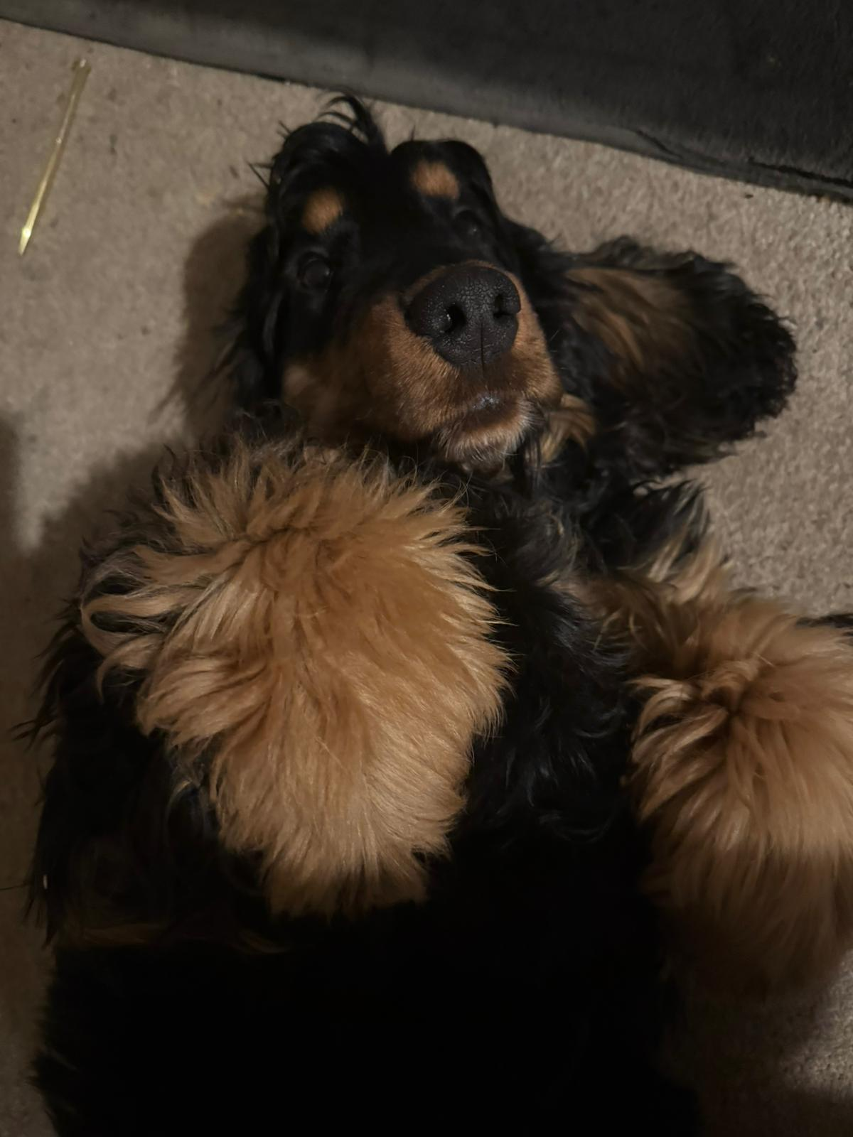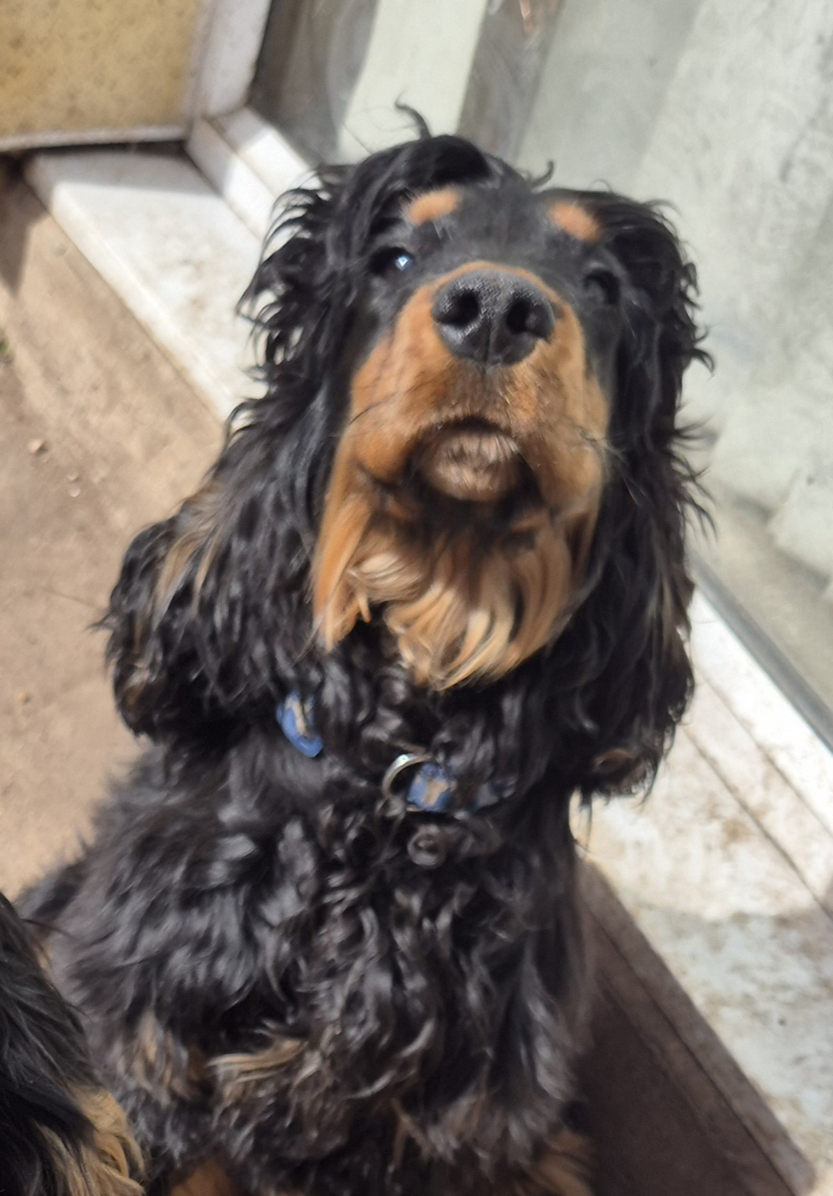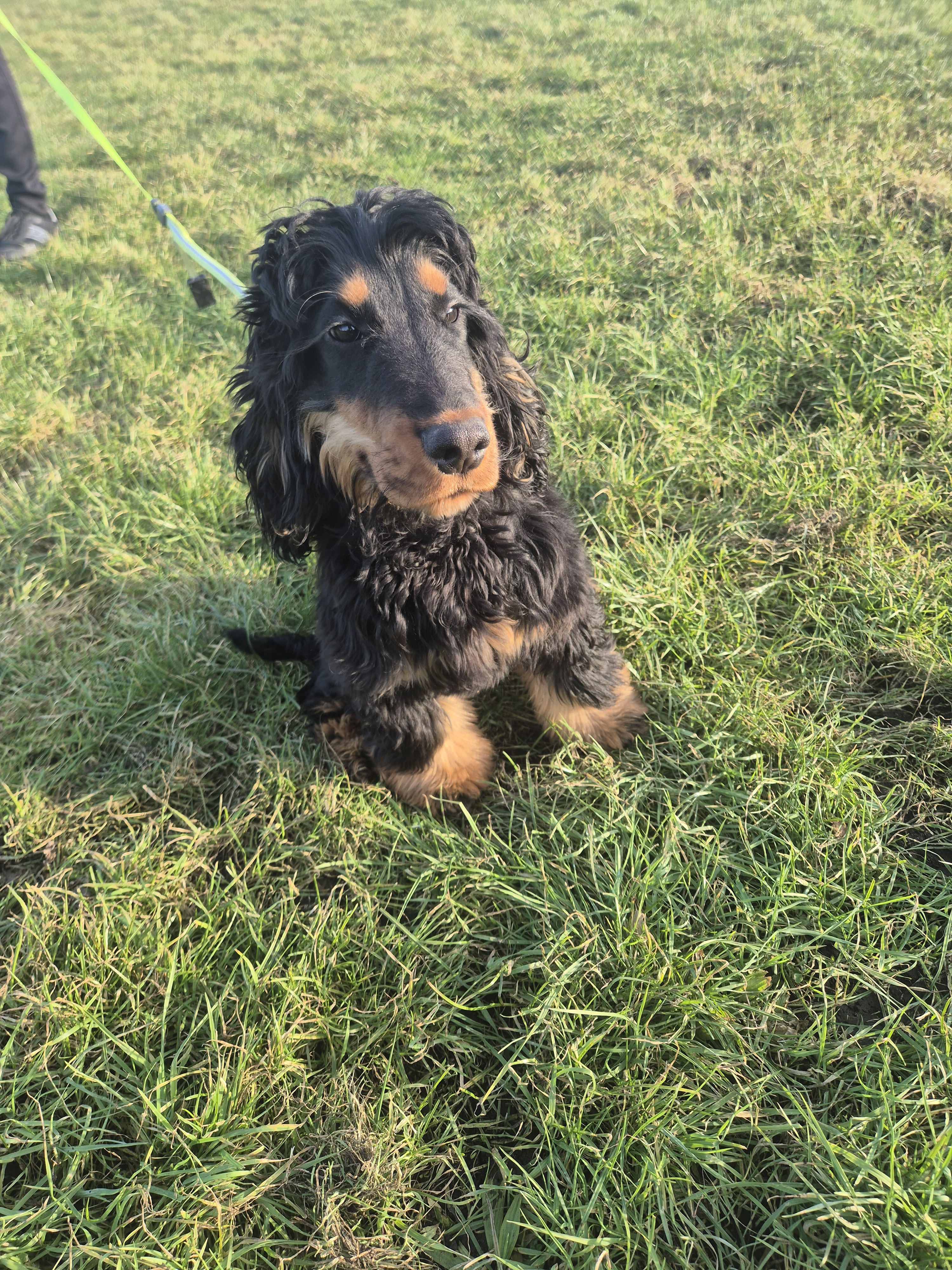 He's a full cocker spaniel boy. We've had him since he was 9 weeks old. He. Has been brought up with other dogs and children. Unsure on whether he will get along with any other animals. He gets barky when someone enters the garden, or knocks on the door. He's been toilet trained and crate trained. He needs more training on his lead.
