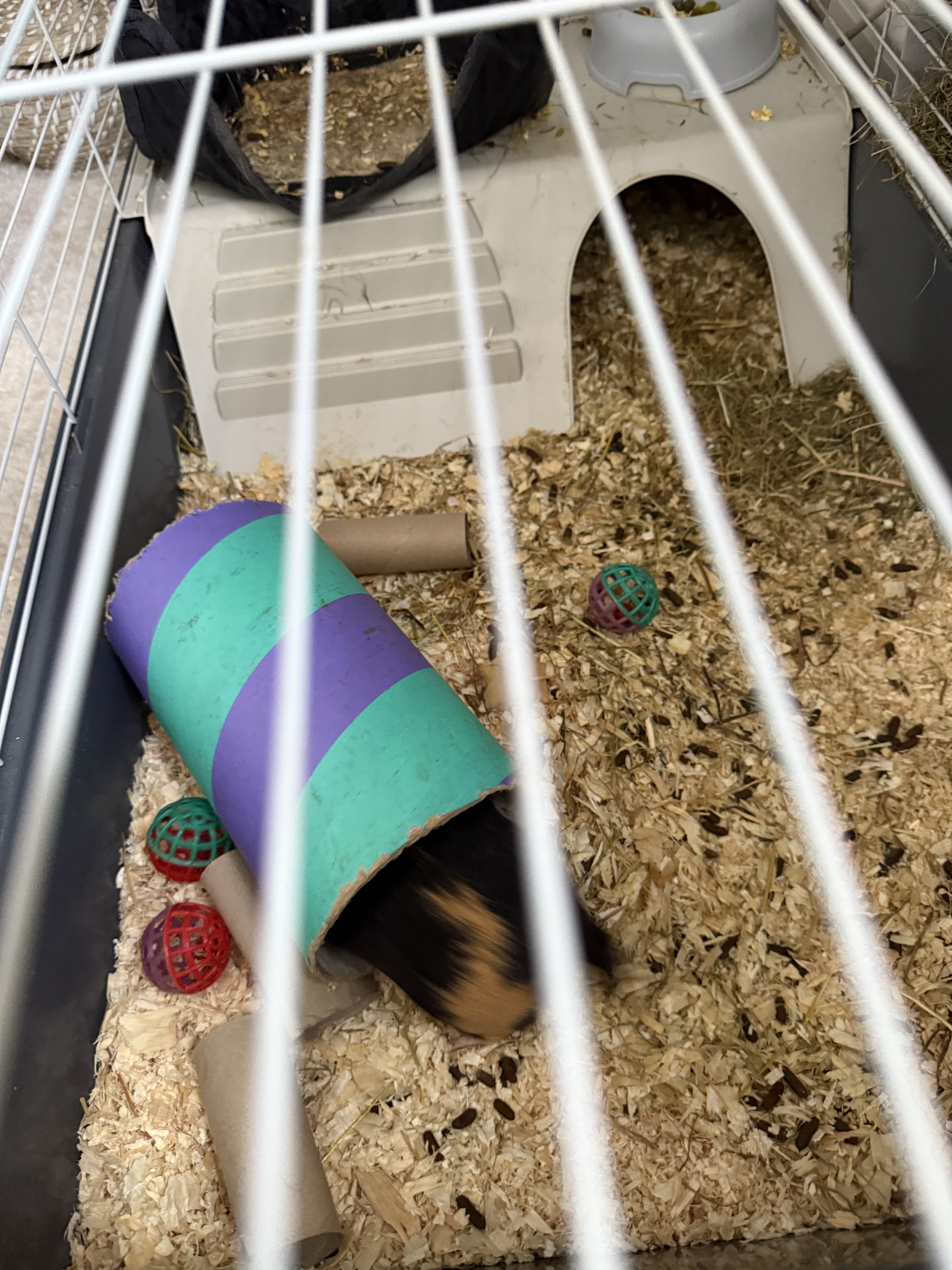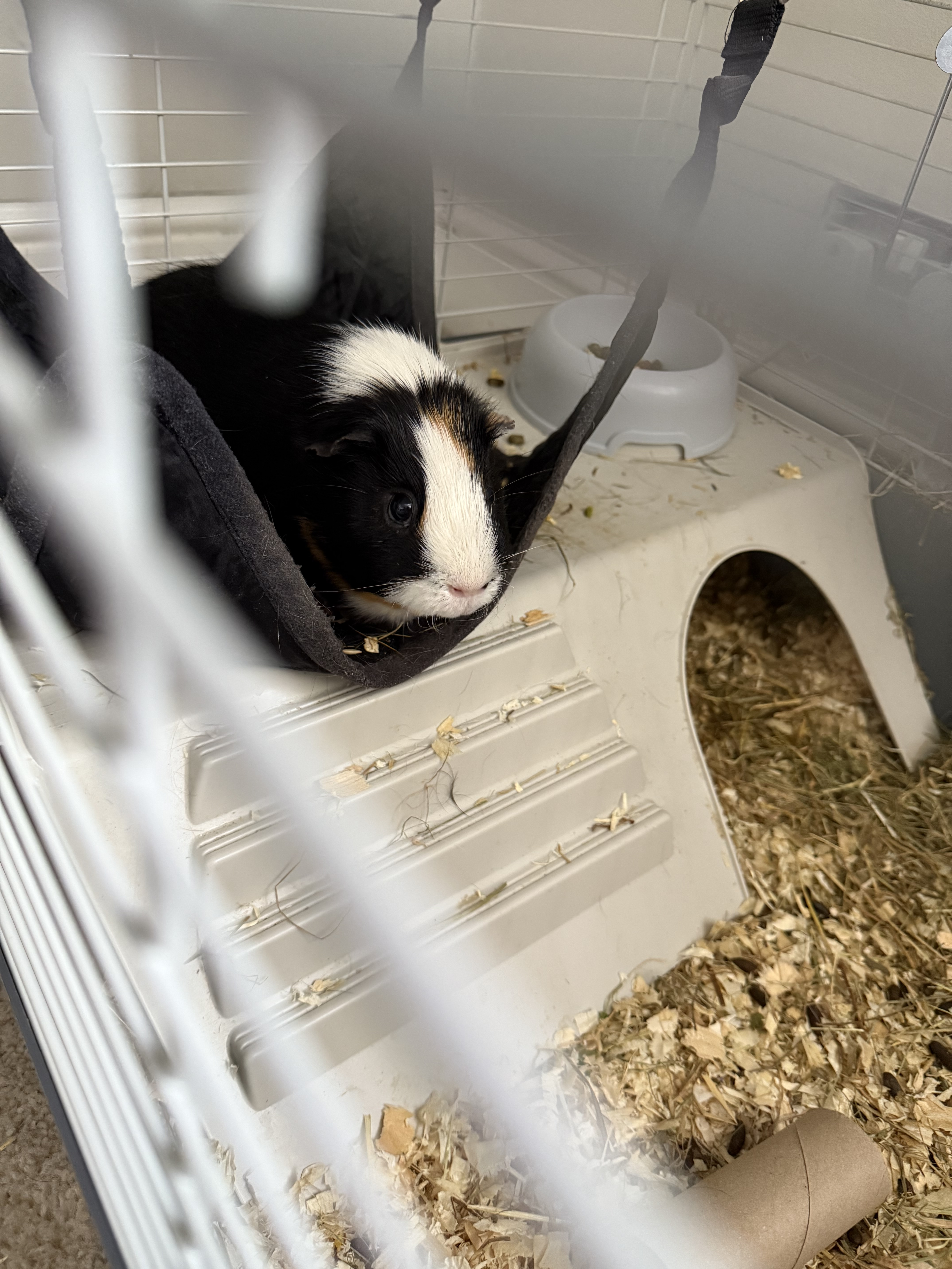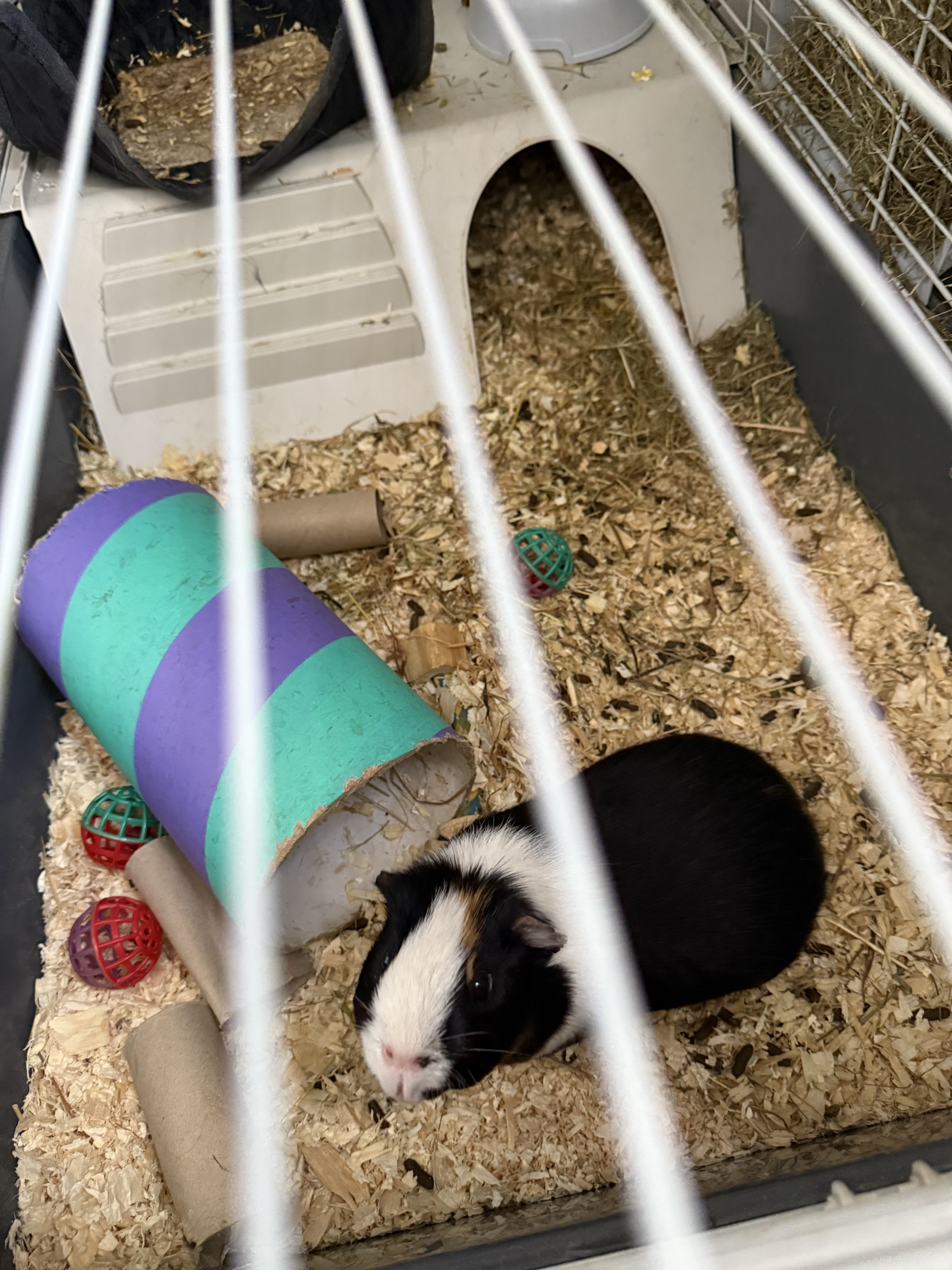 Black and white guinea pig, that is 5 years old and is very friendly who needs lots of social interactions and care.