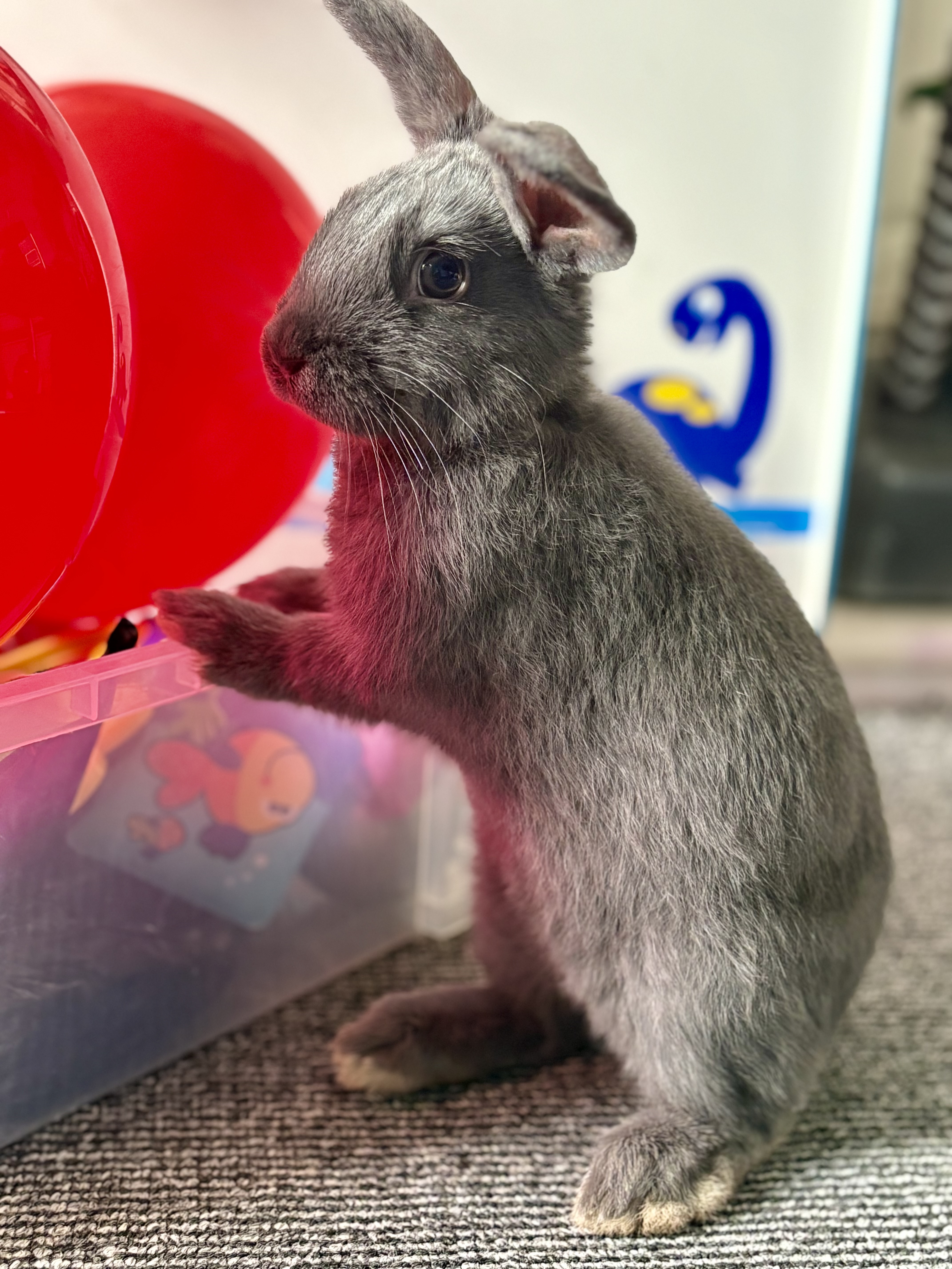 Grey rabbit Likes to run around and climb, indoor rabbit as that’s all he’s known, will come with cage and everything he needs