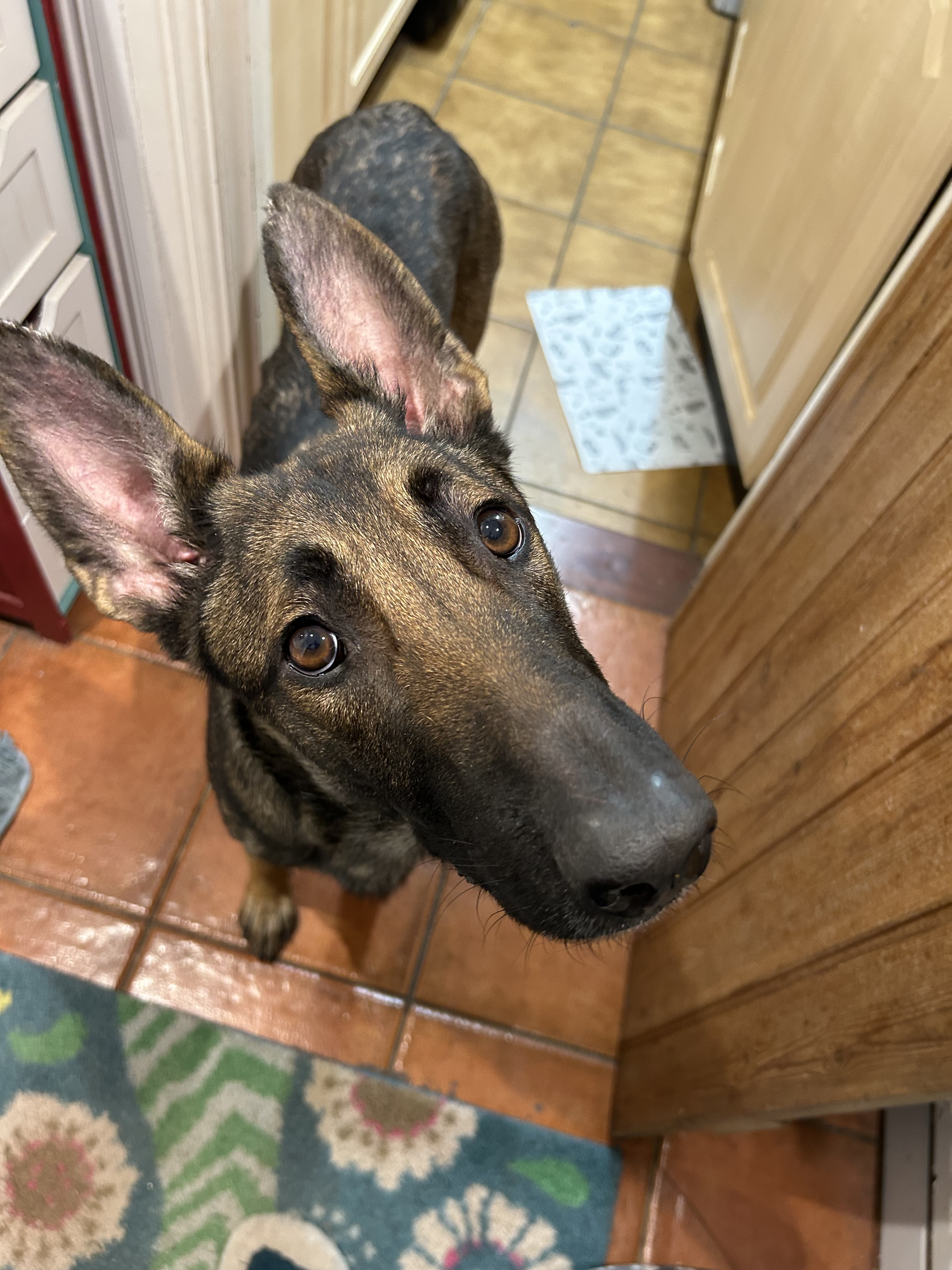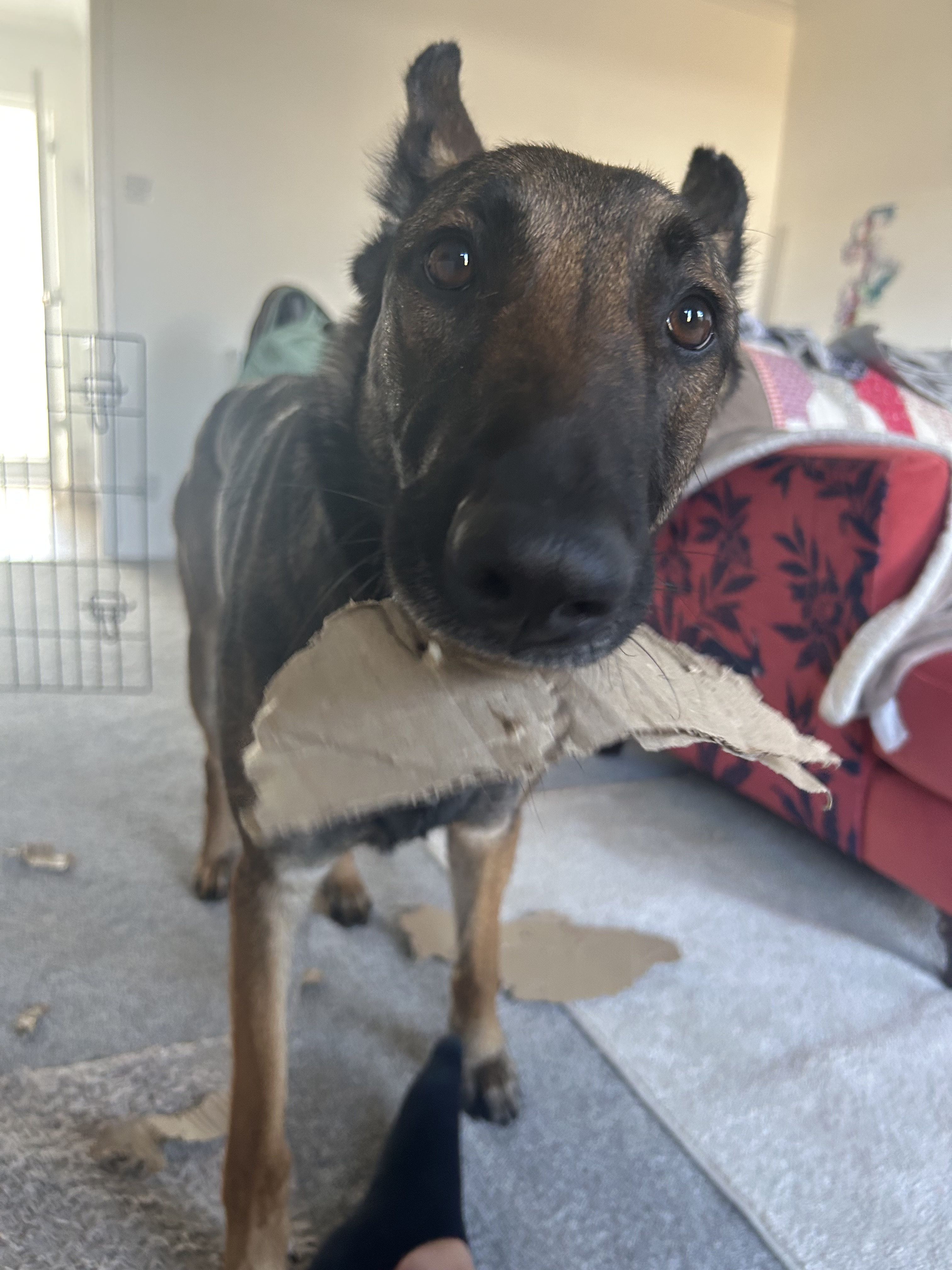 Two and a half year old female GSD x Malinois. Mix colour brown, black with hints of white and tan. Super high energy, unbelievably intelligent and emotionally aware - will try to hug you if you cry! Food and play motivated. She just needs a good home with people who can love her and give her what she deserves
