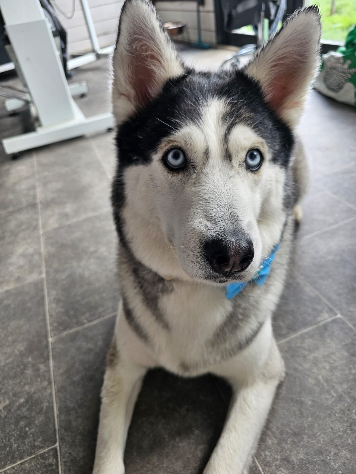 Pomsky breed. 75% Husky 25% Pomeranian Husky markings. Grey and white in colour. Temperament a mix of both breeds, however she is more energetic and needs more stimulation to the husky.