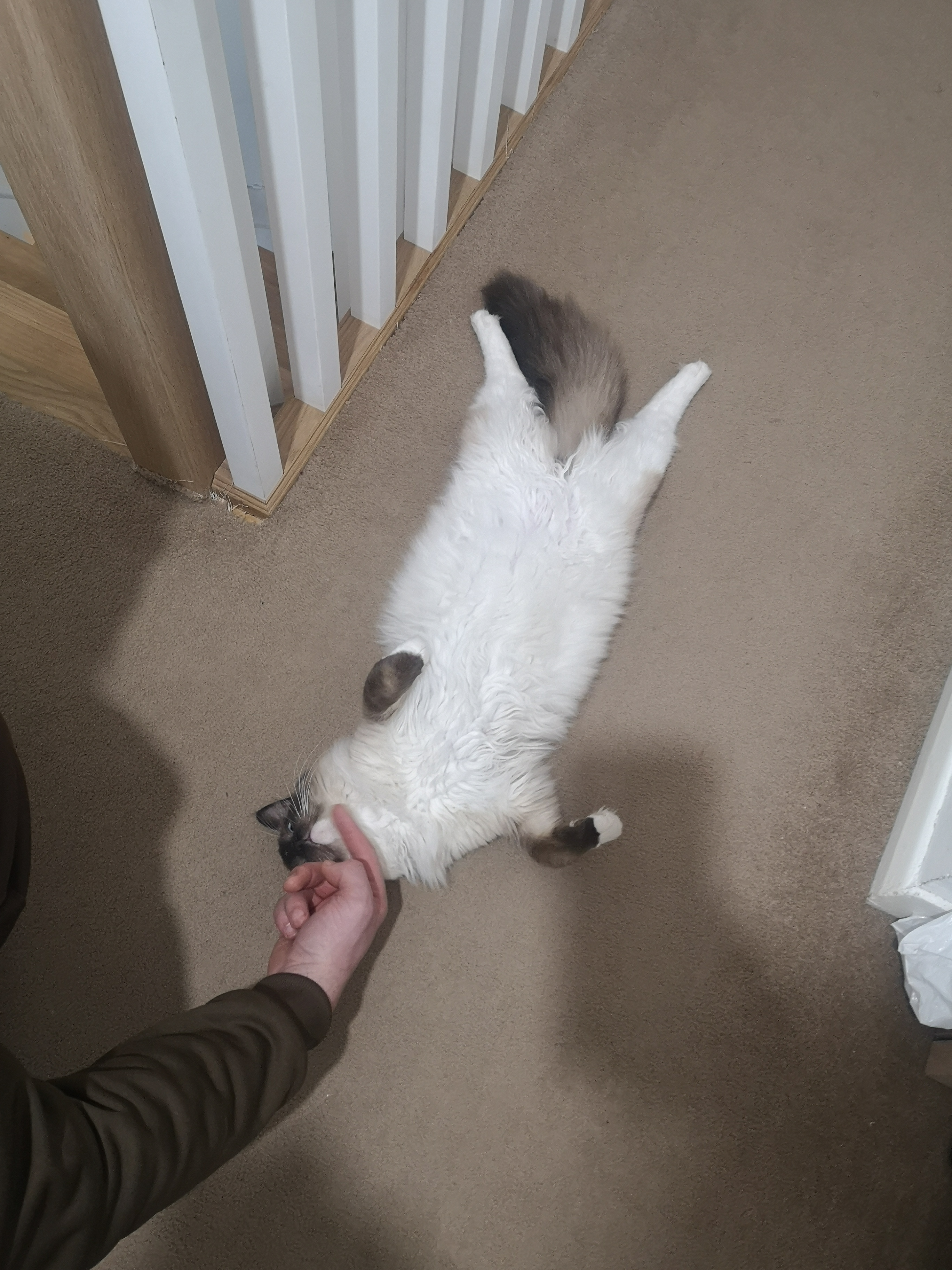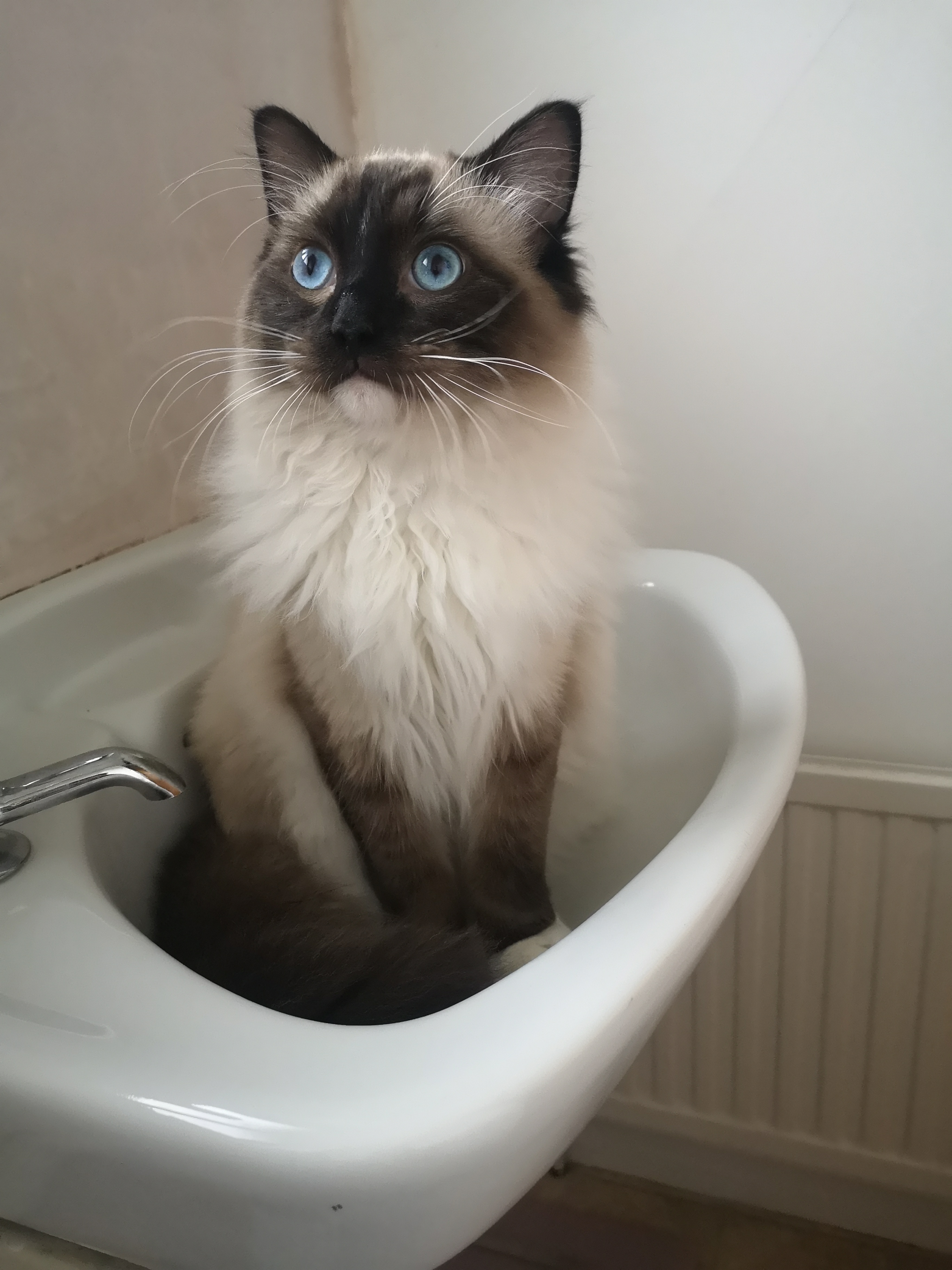 We have only owned Smokey for a very short time but he is extremely adaptable and resilient. He loves a cuddle and long periods of sleep, but also, engages in play. He's 9 months old so still full of character. He is a very good looking pureed seal point ragdoll.