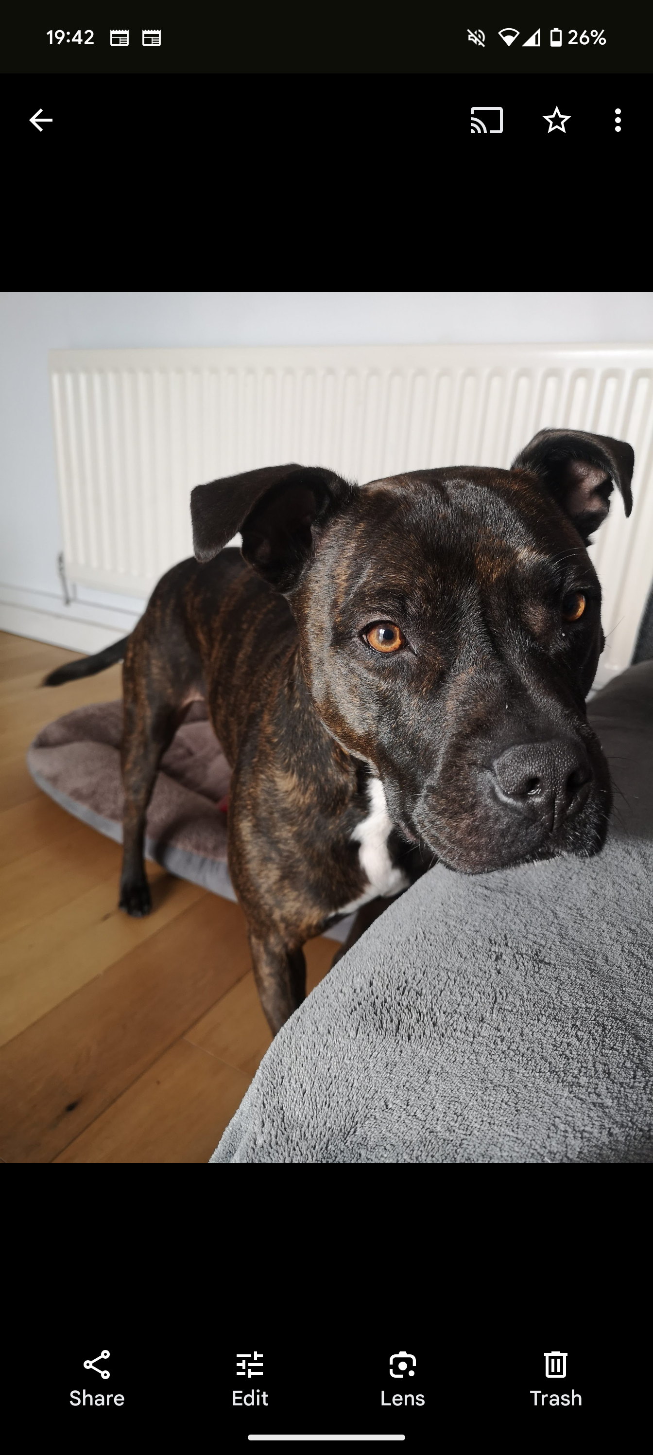 Female, Staffy cross whippet, age 8, neutered and all vaccinations up to date, she's a gentle loving dog with lots of energy, shes a little lame on one off her back leg also has a fatty lump on her side but vet said nothing to worry about.