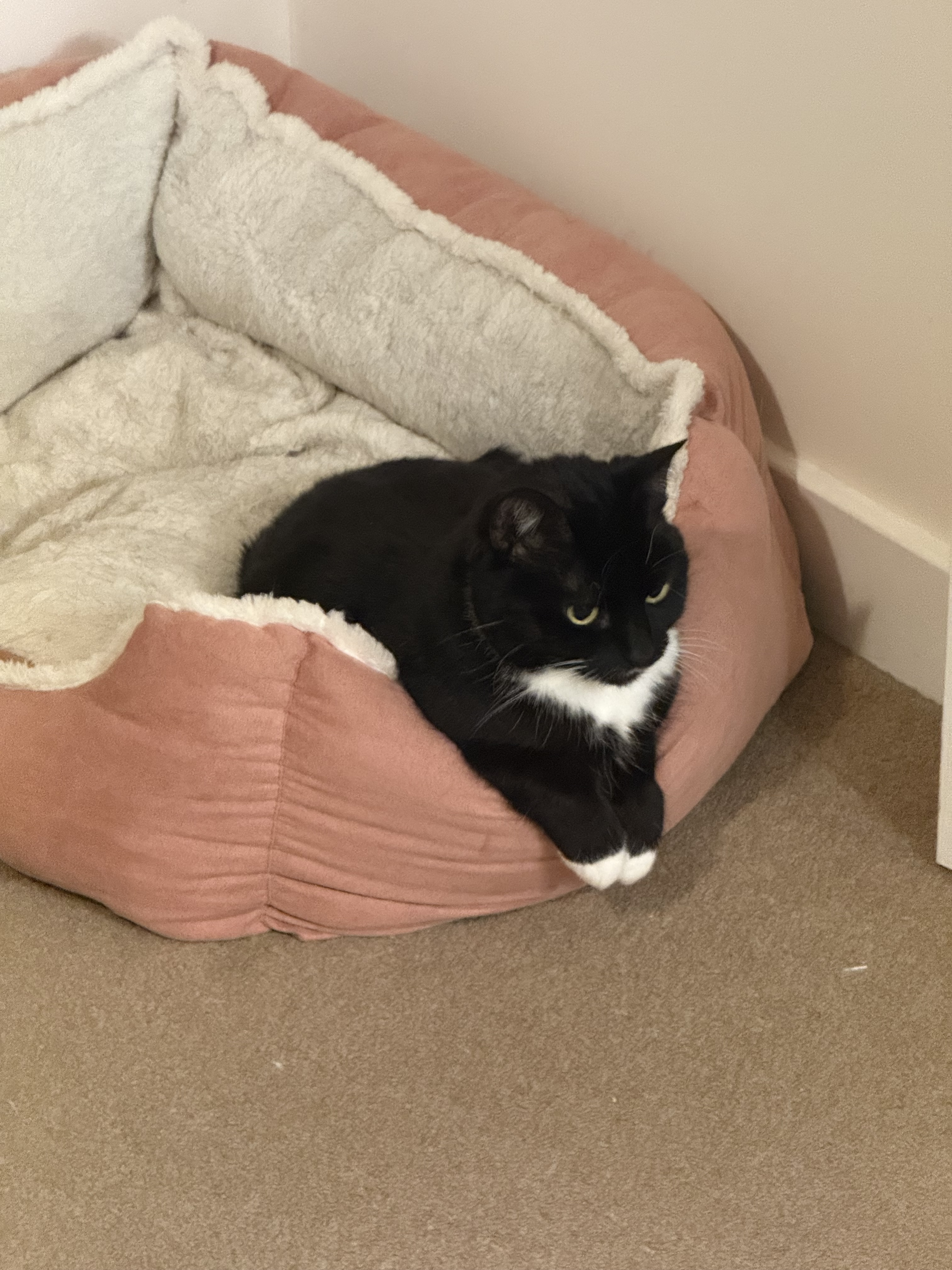 Big ginger Garfield with a freckly nose. Black and white tuxedo princess