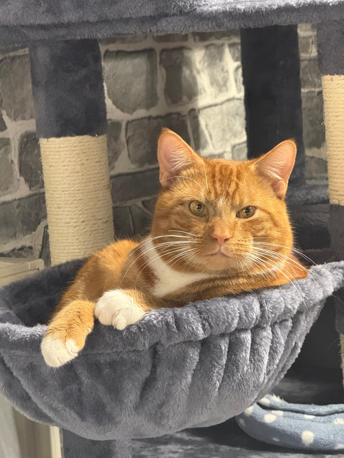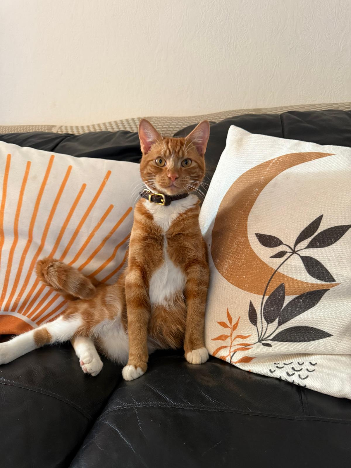 Male cat, 1 year old, ginger and white, neutered, microchipped, and healthy. He has been raised in a loving home and has a friendly, affectionate personality. He enjoys human company, playtime, and relaxing nearby. He loves going out to the garden in the mornings to explore and soak up the sun. Well-mannered and litter-trained, he is used to normal household routines. He is great with children and gets along well with other pets, including cats and dogs, as he has been raised with a dog. Playful yet calm, he would make a wonderful companion for a family or individual looking for a loving cat.