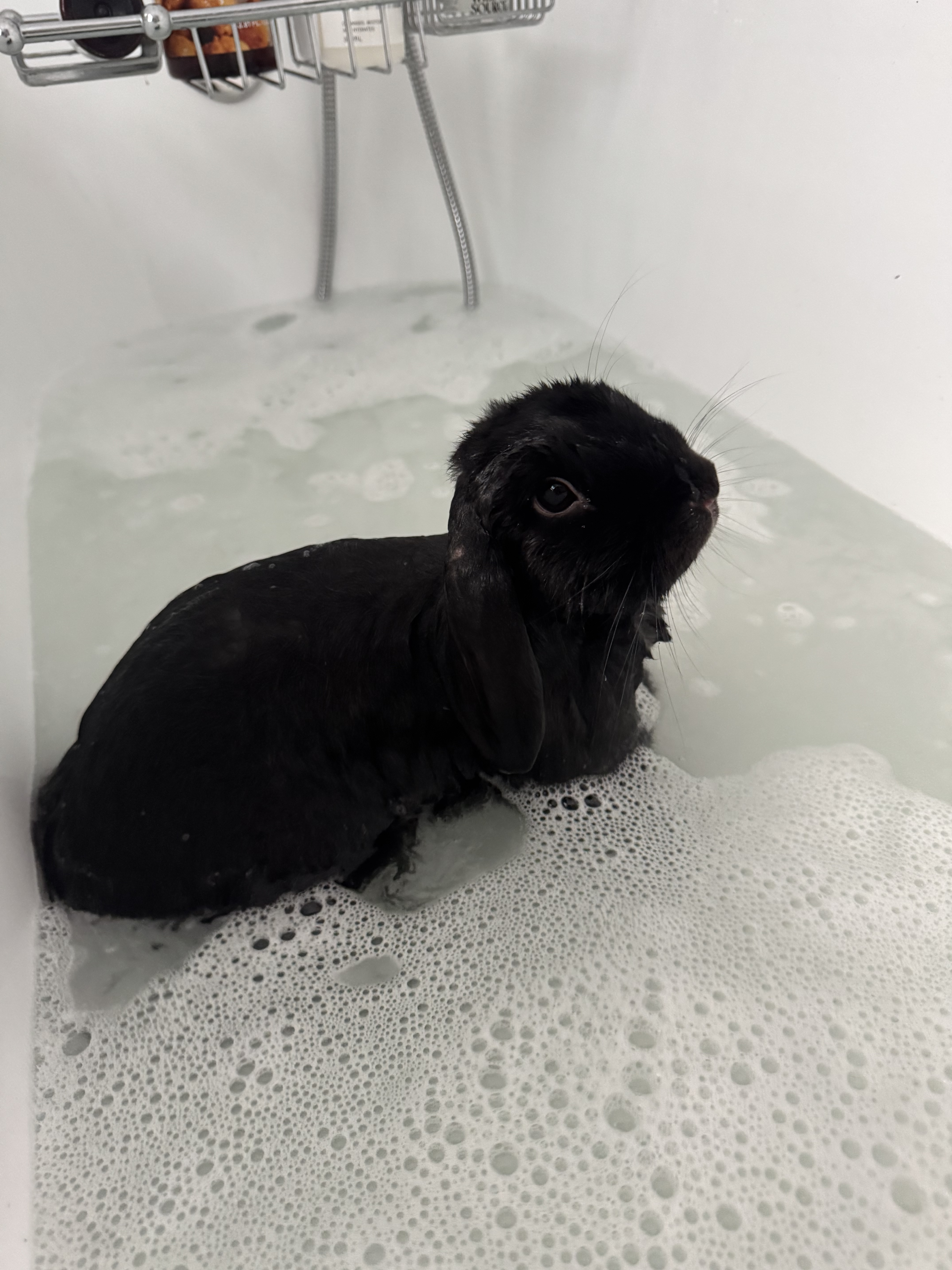 Black, lop hair with beautiful brown eyes. Only markings is the tiniest bit of white fur on her paw.