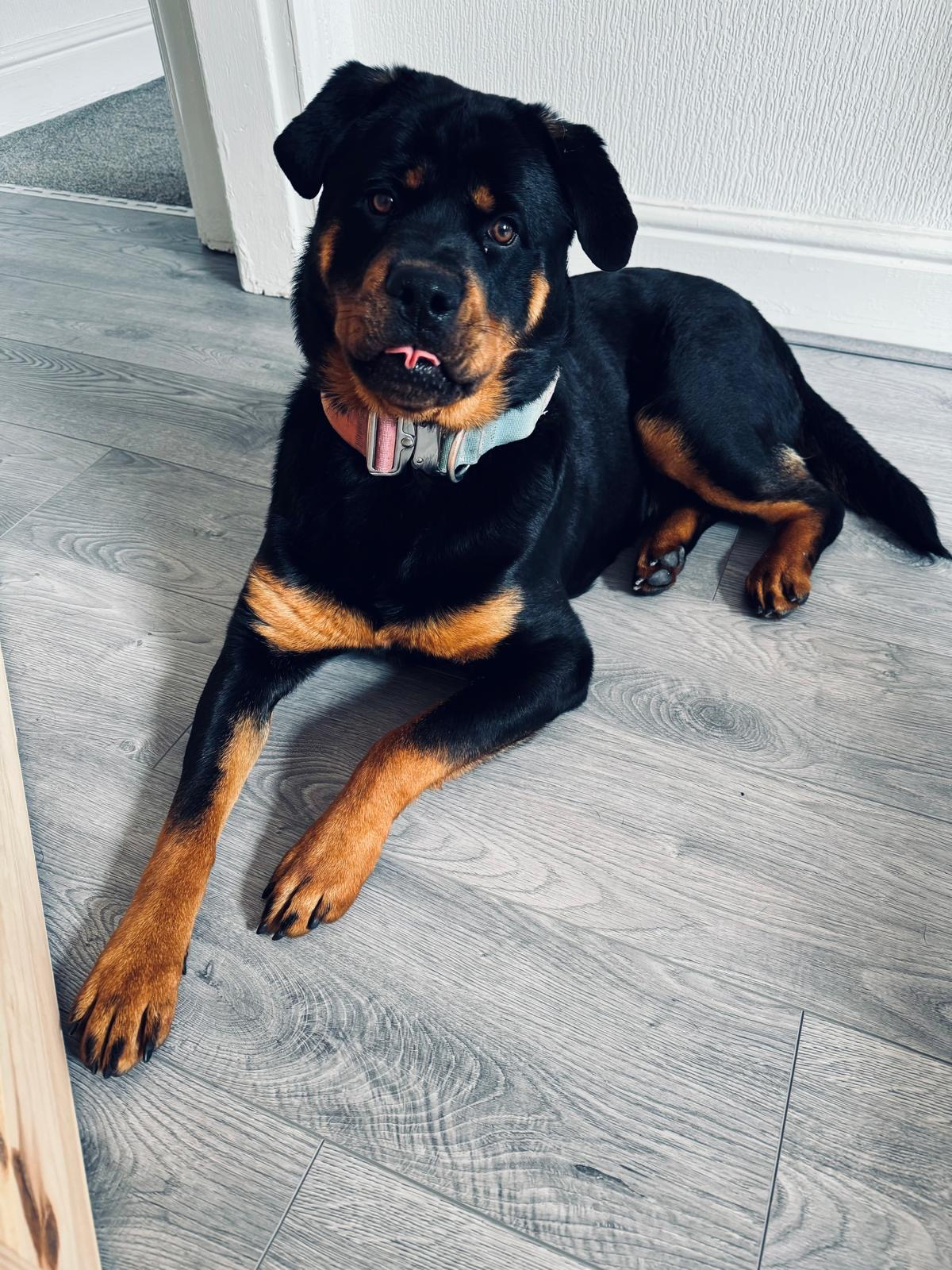 - Unfortunately after a long hard decision, we have decided to rehome our beloved Rottweiler puppy. She is a beautiful dog, and we’ve had her for 18 months, but through no fault of our own, last year we were evicted due to the landlord wanting to sell her house. We have gone from having a large garden with outdoor shelter for her backing on to open space, to having a tiny yard with no shelter, and surrounded by four high walls, with no stimulation for her. Due to our busy life styles, she is left alone for periods of time, and has to be left in the garden due to Rottweiler’s notorious mischievous behaviours. She is a bubbly girl with loads of amazing qualities. She loves going on adventures, long walks, likes to explore water, but won’t fully get in. She loves to run, but has no recall. She likes dog parks where she can have the freedom. She also loves attention and cuddles. She has been raised around children, with 6 children to be exact, however, our two youngest children are terrified of her through no fault of Abel’s. The 2 youngest children become hysterical when she approaches them, which winds Able up. We did not know they were scared of dogs when we got Able and have tried to persevere to let the children adapt, but due to the house move, we have no space to separate them. It truly is breaking our hearts to have to do this, but Able deserves a better life, with someone who can give her the time and space she deserves. Ideally someone without young children as she just doesn’t realise how big she is.