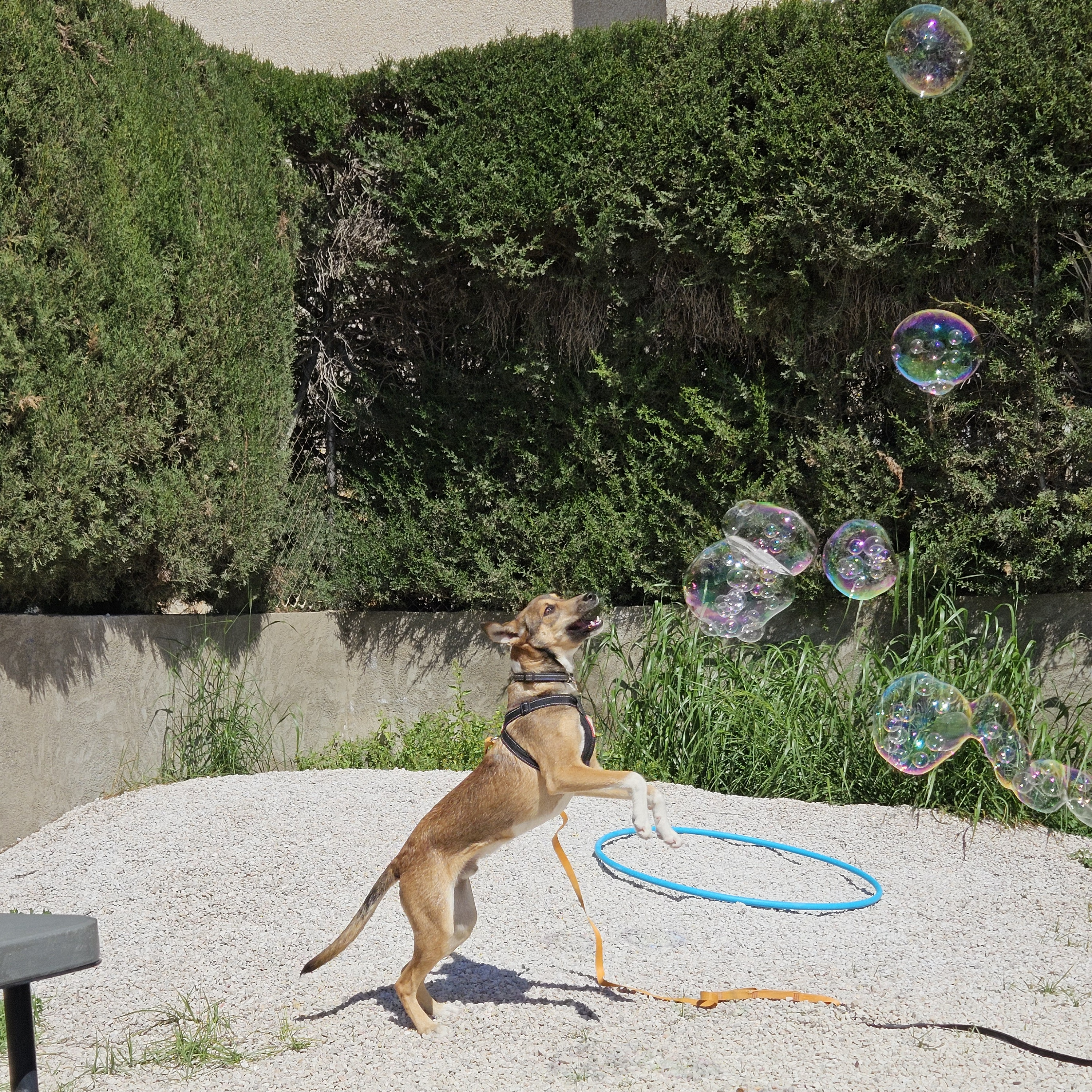 Atlas is an Atlas mountain shepherd breed (hence the name), roughly 9 months old. He's up to date with all his vaccinations, is unneutered, and has a 1-year rabies vaccination. He is also microchipped, holds an EU Spanish passport, and has a titre test certificate. He has the sweetest personality and just wants to be loved. He's not overly affectionate but will come for a snuggle during the day or in the evenings. He loves to play with soft toys and loves to chomp on a bone. However, he hasn't quite mastered the art of fetch yet. On lead, he is great — he doesn’t pull and responds well to commands. He is good off lead in a quiet, open space, though he still gets easily distracted by wildlife. A new owner will need to gain his trust and practise these commands with high valued treats such as chicken or cheese. Off lead recall is still working progress due to him becoming a teen his ears a little hit and miss still! For his diet, we currently feed him twice a day with Wainwright’s puppy kibble, adding tinned meat to his evening meal. Throughout the day, he usually has a bone, fruit, a lick mat, or a snuffle treat ball. As he is a rescue, so he does get nervous and protective of his home and tends to bark or growl at things coming near. But once he greets them with a sniff, he just wants to play. We can travel anywhere in the country if it means Atlas will receive the loving home and space he deserves.