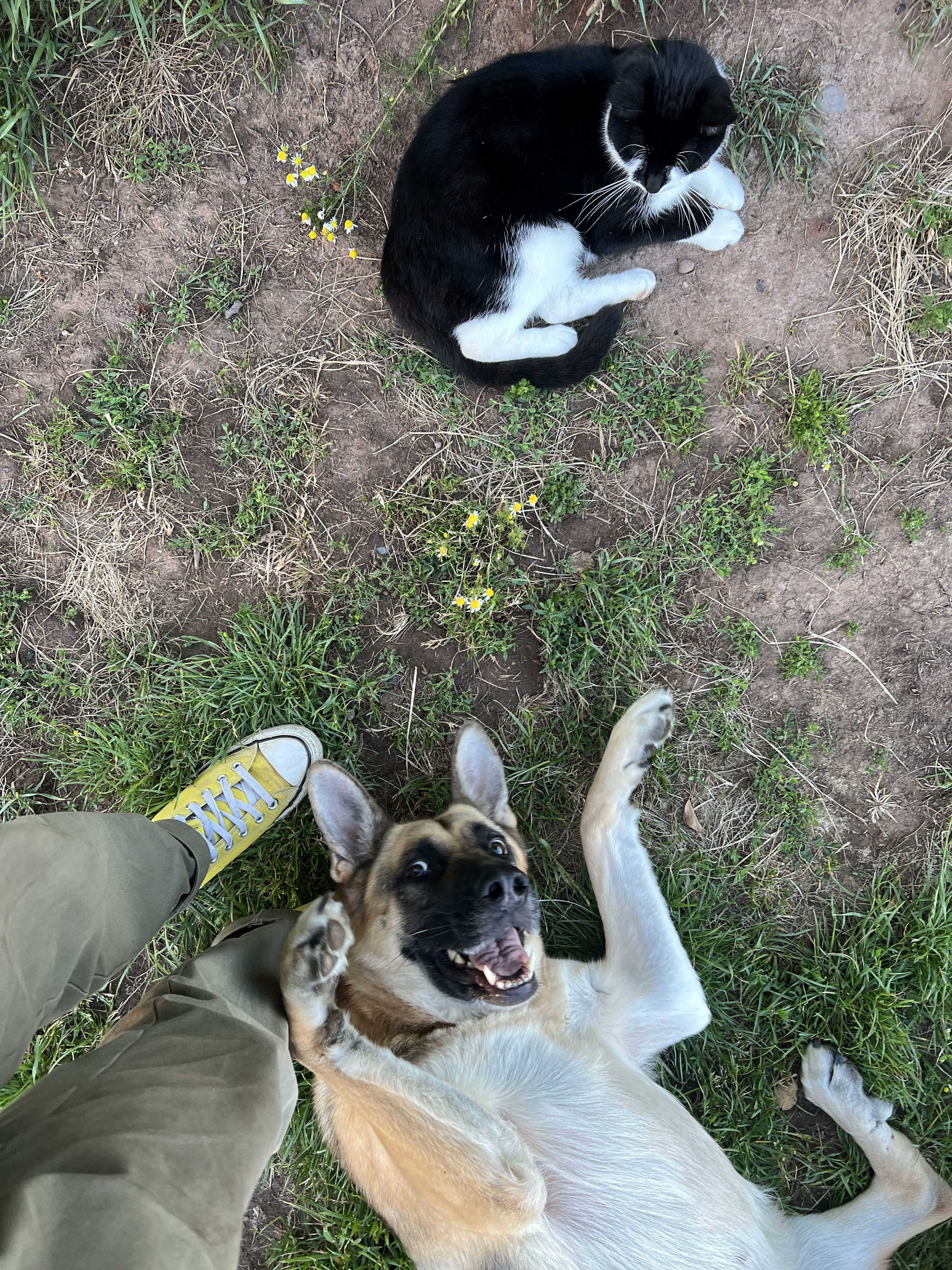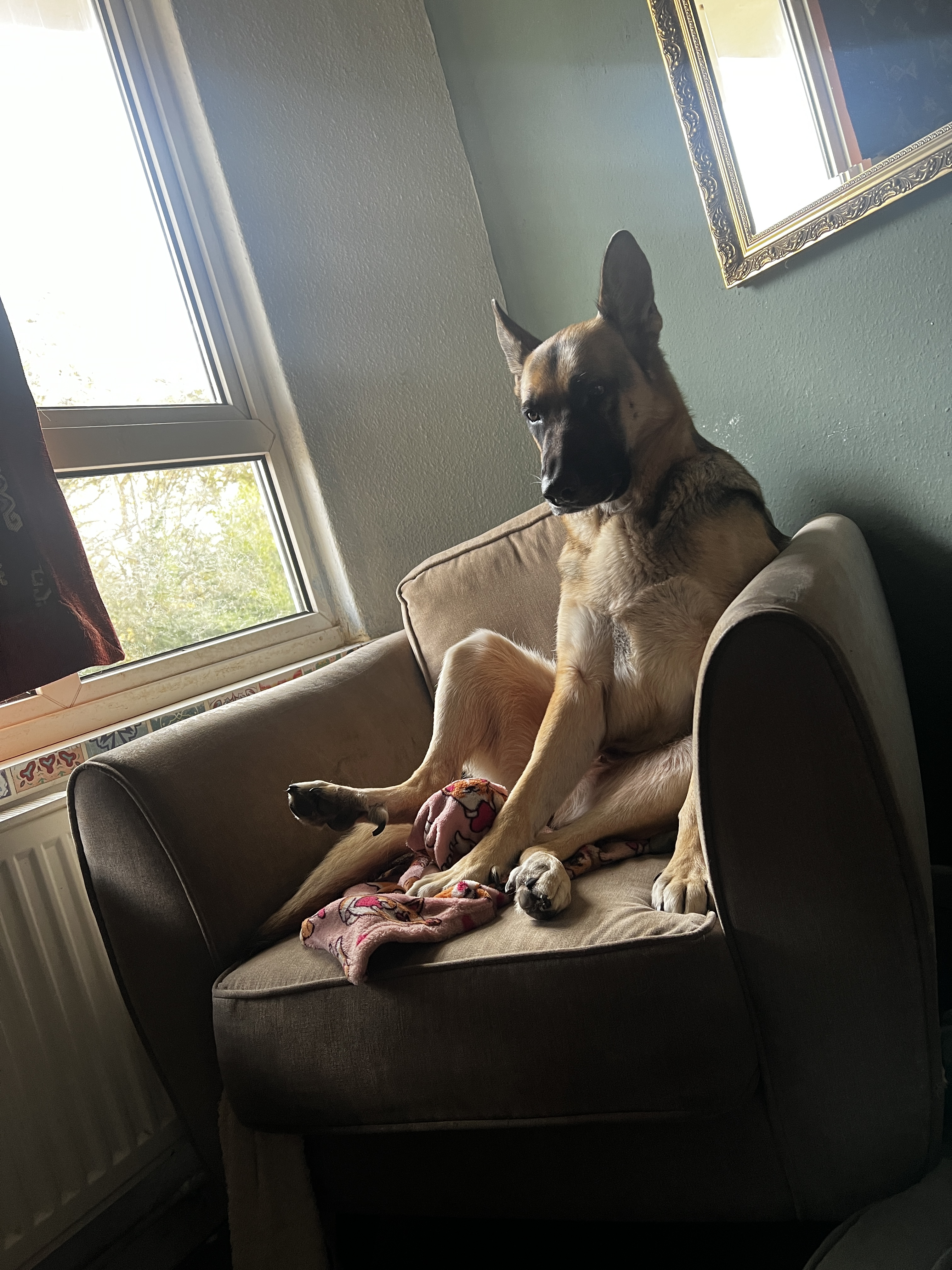 - anxiety developed anxiety when i am present with the other dogs in household and will just spin and chew herself to self soothe but will not exhibit behaviour if im away