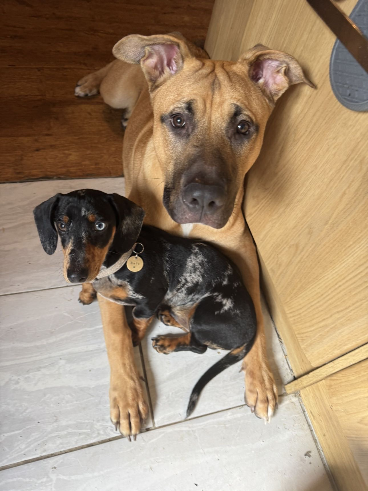 - A home with another dog that is large sized would be ideal for him. No kids as he knocks them over.