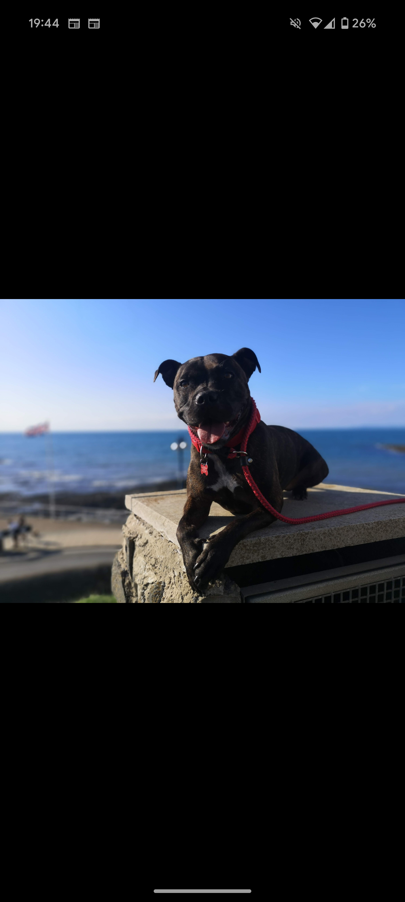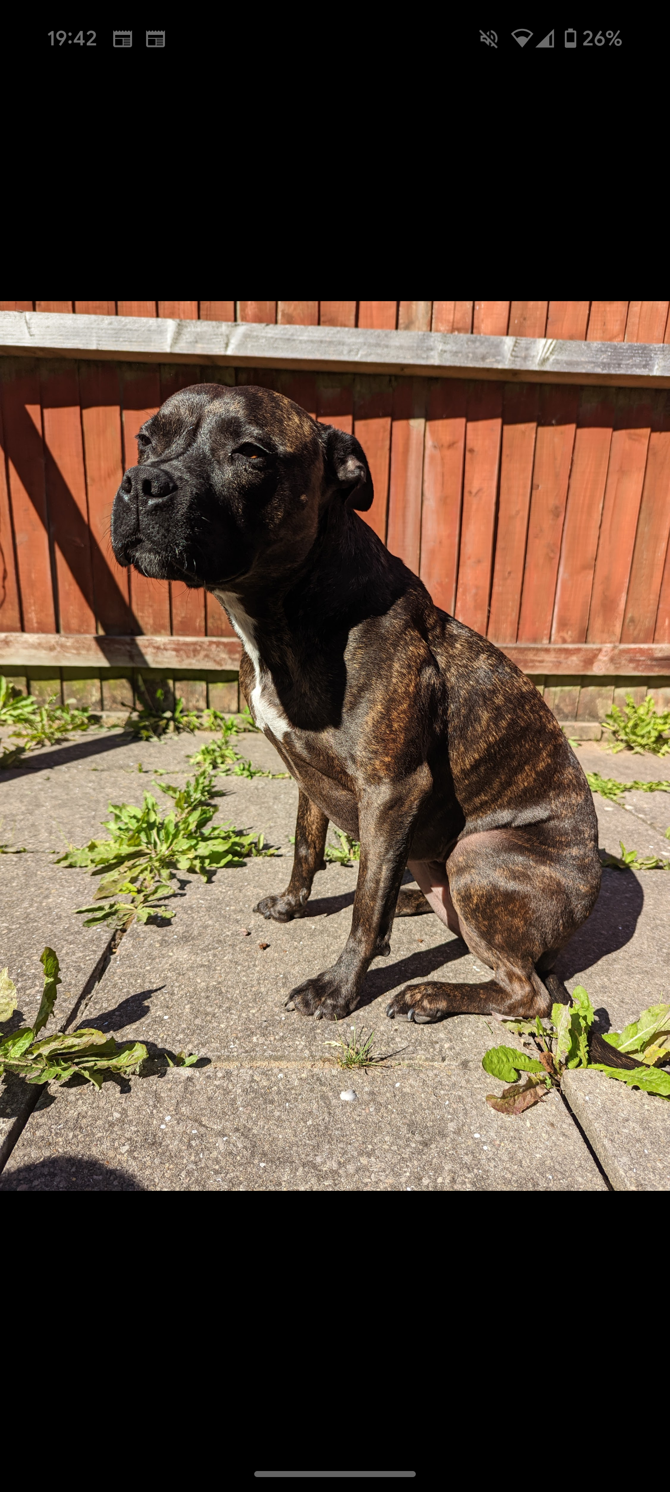 Female, Staffy cross whippet, age 8, neutered and all vaccinations up to date, she's a gentle loving dog with lots of energy, shes a little lame on one off her back leg also has a fatty lump on her side but vet said nothing to worry about.