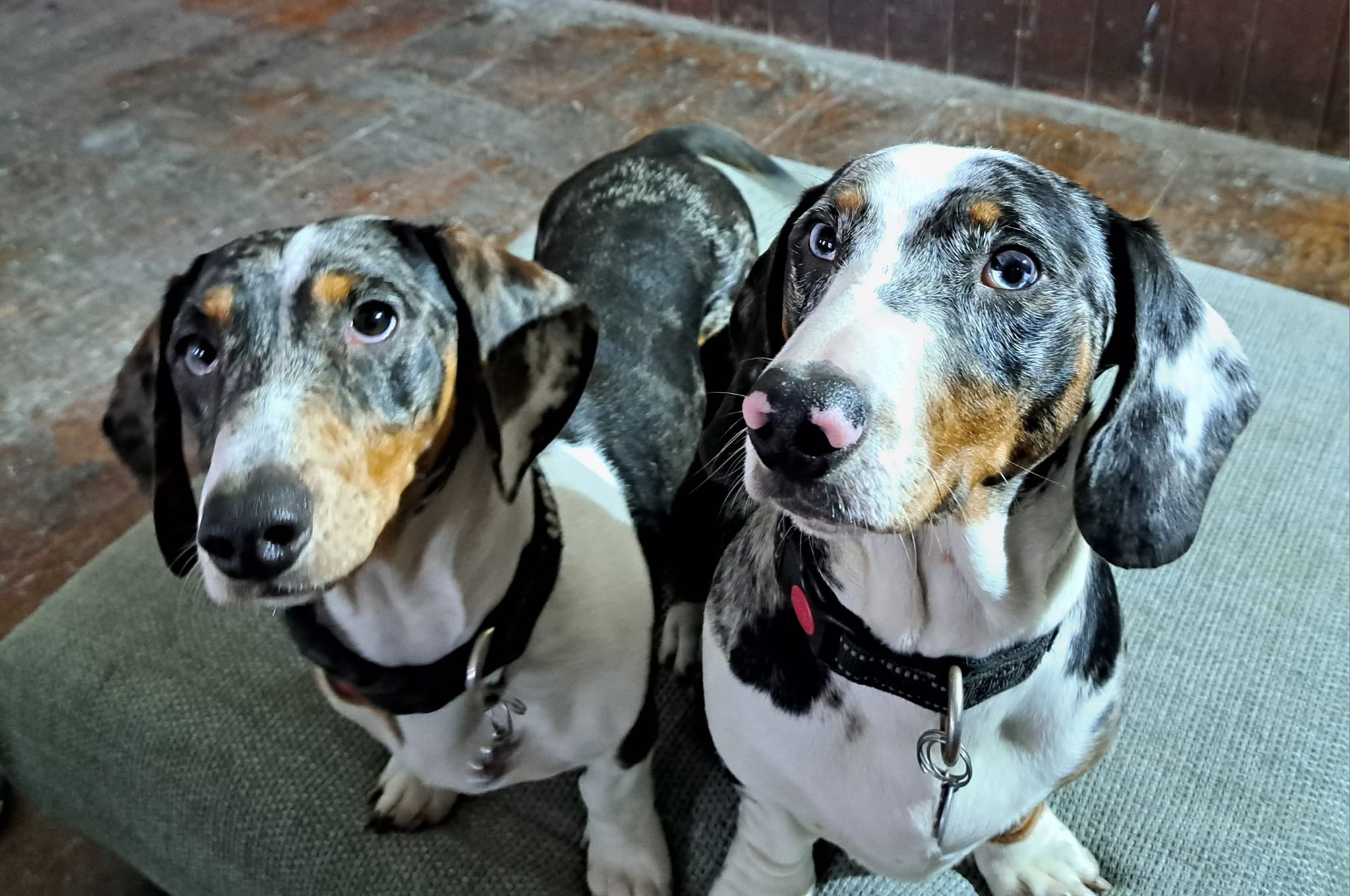 2 Dachshund boys for rehome. Walter and Wilbur. They love snuggles and are very affectionate. They have separation anxiety so they don't like it when we leave the home. We would like them to go to a home with land/farm and they must go together as they are brothers. They don't play well with other dogs they don't know, but they currently live with 2 elderly beagles without a problem . We are based in North Wales and would drop them off to see the property/ land. They are both castrated. They play well with our toddler who is 18 month Able to ignore/not react to other dogs on walks? Sometimes they bark. They live with 2 elderly beagles. Cat friendly? Unsure, they will chase them out the garden Good with young children? Yes. Any health issues, current or past, for example ear infections, heavy plaque on teeth? Wilbur the small one is short sighted Any behavioural issues? Slight separation anxiety so they don't like it when we leave the home. They bark/whine. Walk well on lead? Yes mostly. Can get distracted. Can be let off lead (good recall)? Not great recall without a treat How long can they be left alone before suffering separation anxiety and how to they display their anxiety? They bark House trained? They are house trained. Sleep in cage at night. Microchipped in your name? Yes on request Travel well? Yes they travel in a cage in my van. They bark when they need the loo which is good. How long have you owned your dogs? 3 years.
